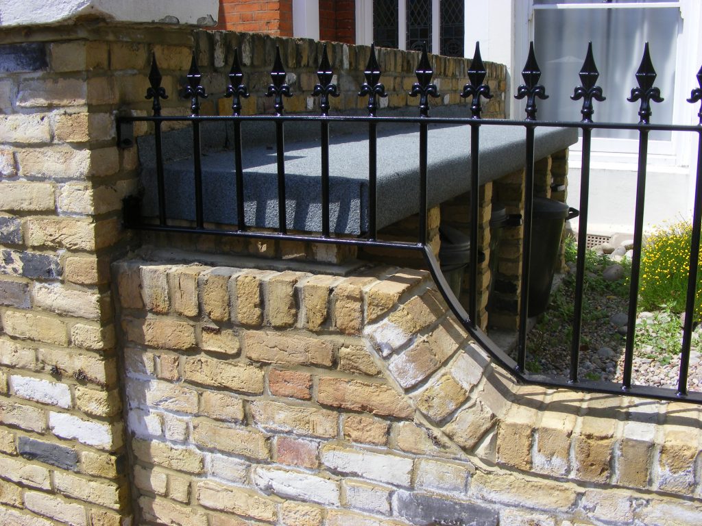Wrought iron railings, Garden wall railings, made to measure. On a slope that isn’t an issue, railing can be made to follow the slope. If the wall is shaped railings can be made to follow the contour of the wall. On a curved wall we can make steel railings to follow the curve. Whilst i have lots of designs on file I are more than happy to design something to fit your requirements or accept an individual bespoke commission.