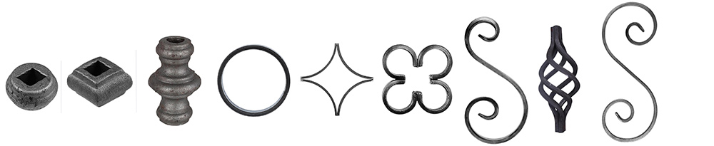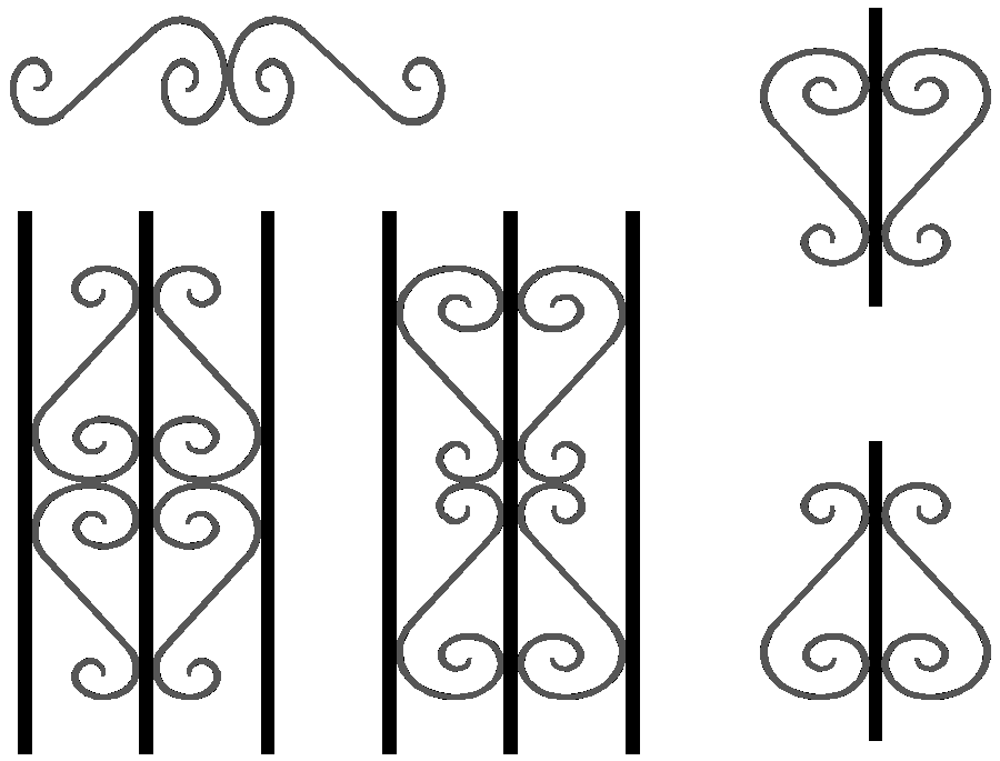 A lot of the design work is based on using parts or components to help create decorative bars. Some parts are designed to be fitted into the upright bar, become part of the bar. Cut out a section of the bar and welded in. Some parts are design to fit in to the gap between upright bars. Some parts can do both. Its the placing of these parts within or on a bar that gives you a bar design. It is then the placing of those bar within the wrought iron panel that gives you your design. By doing that you can create you own individual personal design.