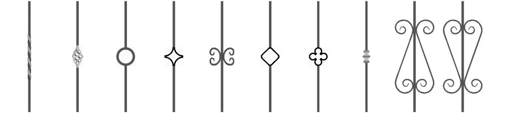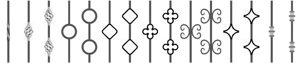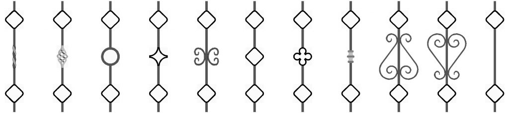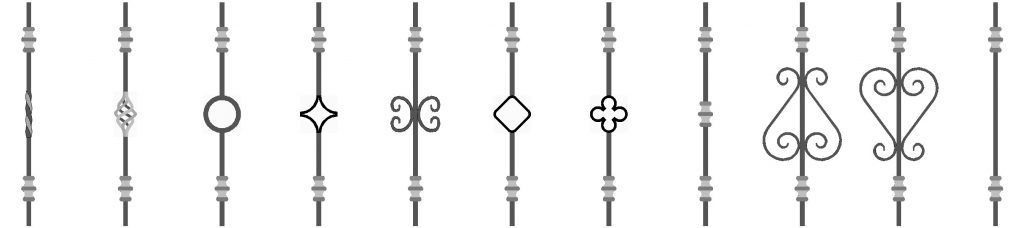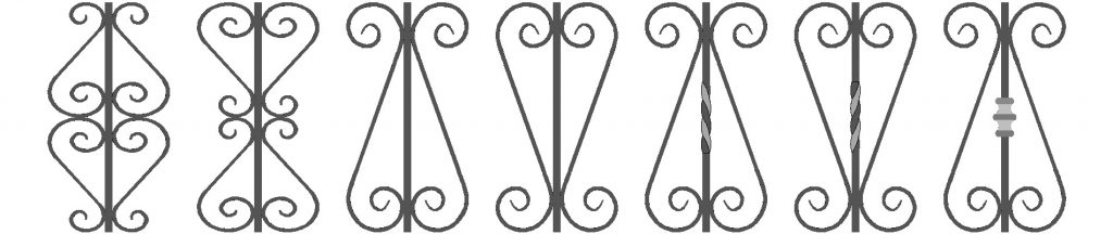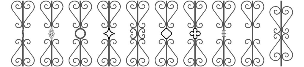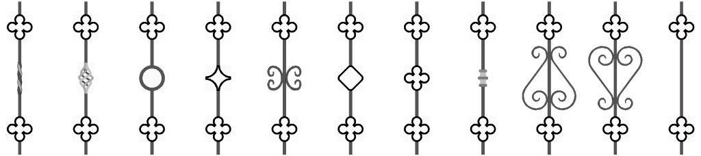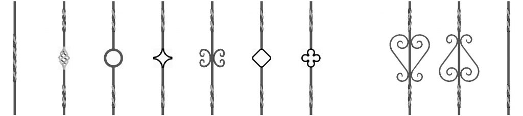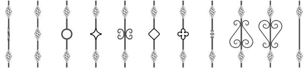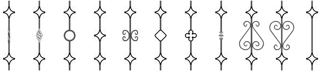 I am quite sure you could use a collar in place rather than a twist on the last two. Either way you have 14 possibilities drawn for bar designs. Depending on the length of the rail. that will easy give 3000+ possible designs, for a dwarf railing. Then you have to choose what goes on top, different railing heads or scroll top. That is at least 6 possible. so enough to cover you for 18,000 possible designs.