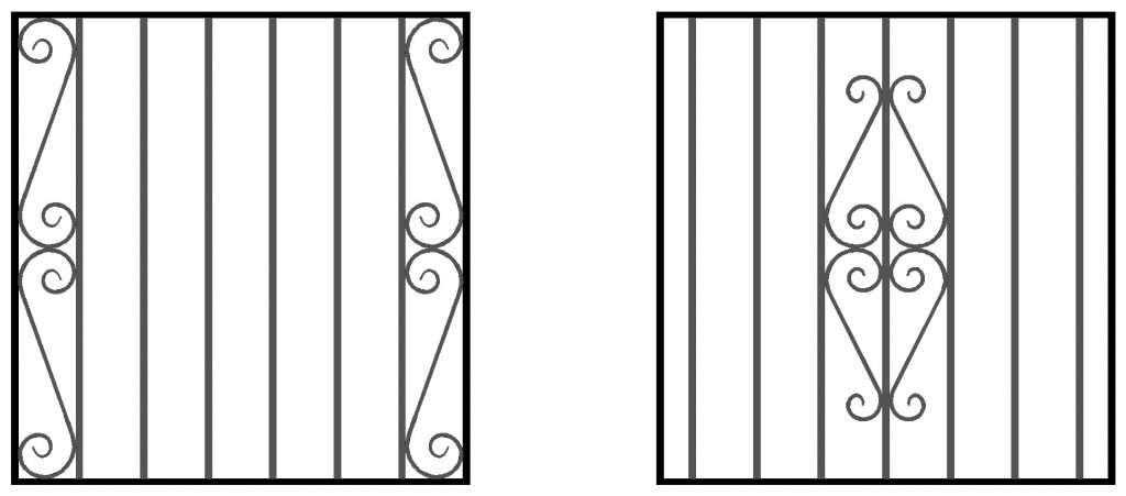 An 800mm frame designed for a 910mm opening. left 6 upright bars, meaning no centre bar. Not the end of the world. The right a centre bar is forced into an 800mm frame. meaning the outer bars are now much closer to the frame. This may exclude the ability to have detail in the outer bars. A twist would obviously fit, but scrolls as per left drawing won’t fit.
