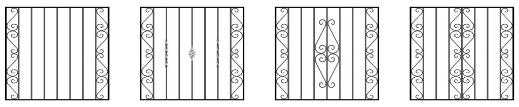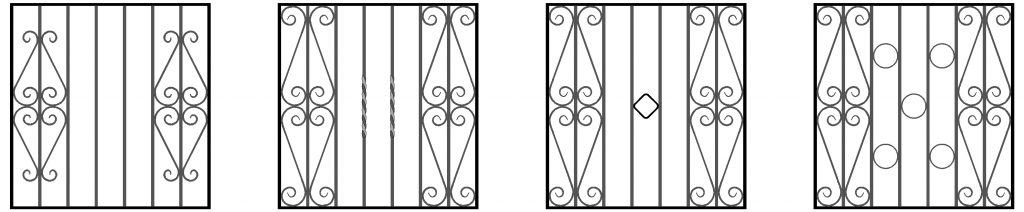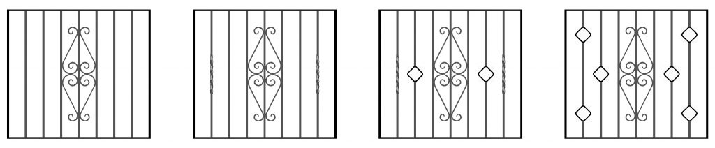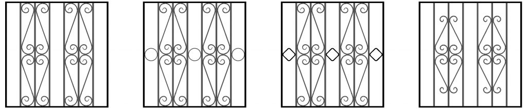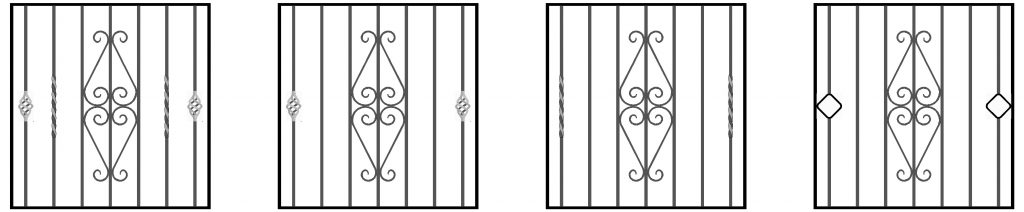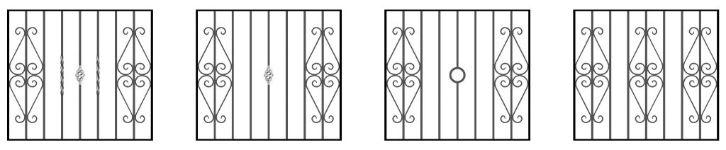 An 790mm frame designed for a 910mm opening. left 6 upright bars, meaning no centre bar. Not the end of the world. The right a centre bar is forced into an 800mm frame. meaning the outer bars are now much closer to the frame. This may exclude the ability to have detail in the outer bars. A twist would obviously fit, but scrolls as per the left drawing won’t fit.