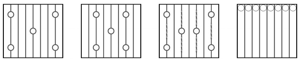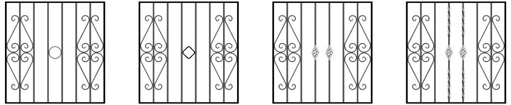 A few examples here, just to point out there could be issues with what you put in the fist and last bar, a Square just fits in the last drawing. but no chance of a pair of scrolls. The following drawings are for a 1mtr wide gate, which does contain a centre bar. if choose the option above and force a centre bar, look below for examples.