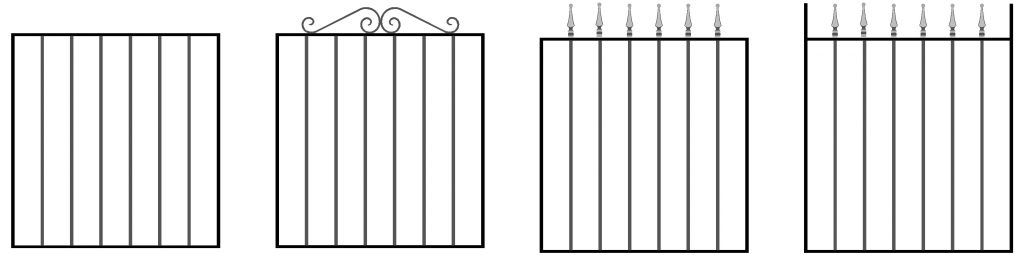 The second drawing is its own top decoration, after it is just a rectangular frame. With a half circle on top. it doesn’t really leave much room to do anything else. The third and the forth one are only really suitable to either leave plain or use decorative railing heads. As decorative railing heads are common to gates and railings, i will have those on their own reference page. So that just leaves the plain rectangular frame to deal with