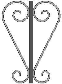 A pair of S scrolls welded to a bar. This is usually done so that the Scroll pair touch the upright bar they are on and the bar next to them. This does mean each scroll needs to be made to fit the gap between upright bars. Of the five pieces in this series it is the only one that needs to be made on a one off basis.