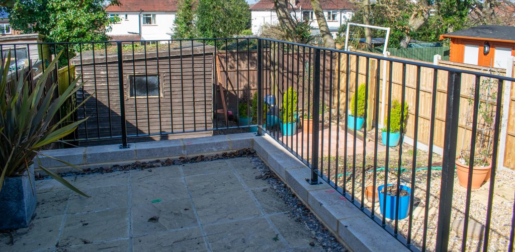Patio railings, designed to guard against falling off a raised patio. Usually required to comply with building regulation and thus need to be 1100mm tall. Posts bolted down through the patio. Or concreted in during construction with railings fitted once patio is complete. Designs can be plain and functional or have detail to them.